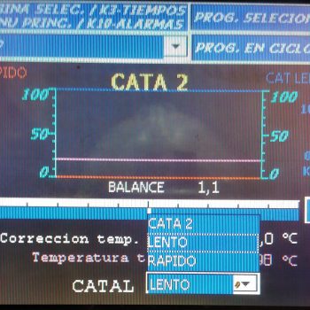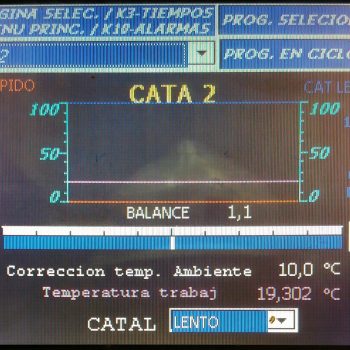 HMI con visualización mejorada: rediseño de pantallas para visualizar en tiempo real consumos, temperatura de trabajo, dosificación de catalizadores/resinas, correcciones por temperatura ambiente y selección de programa.